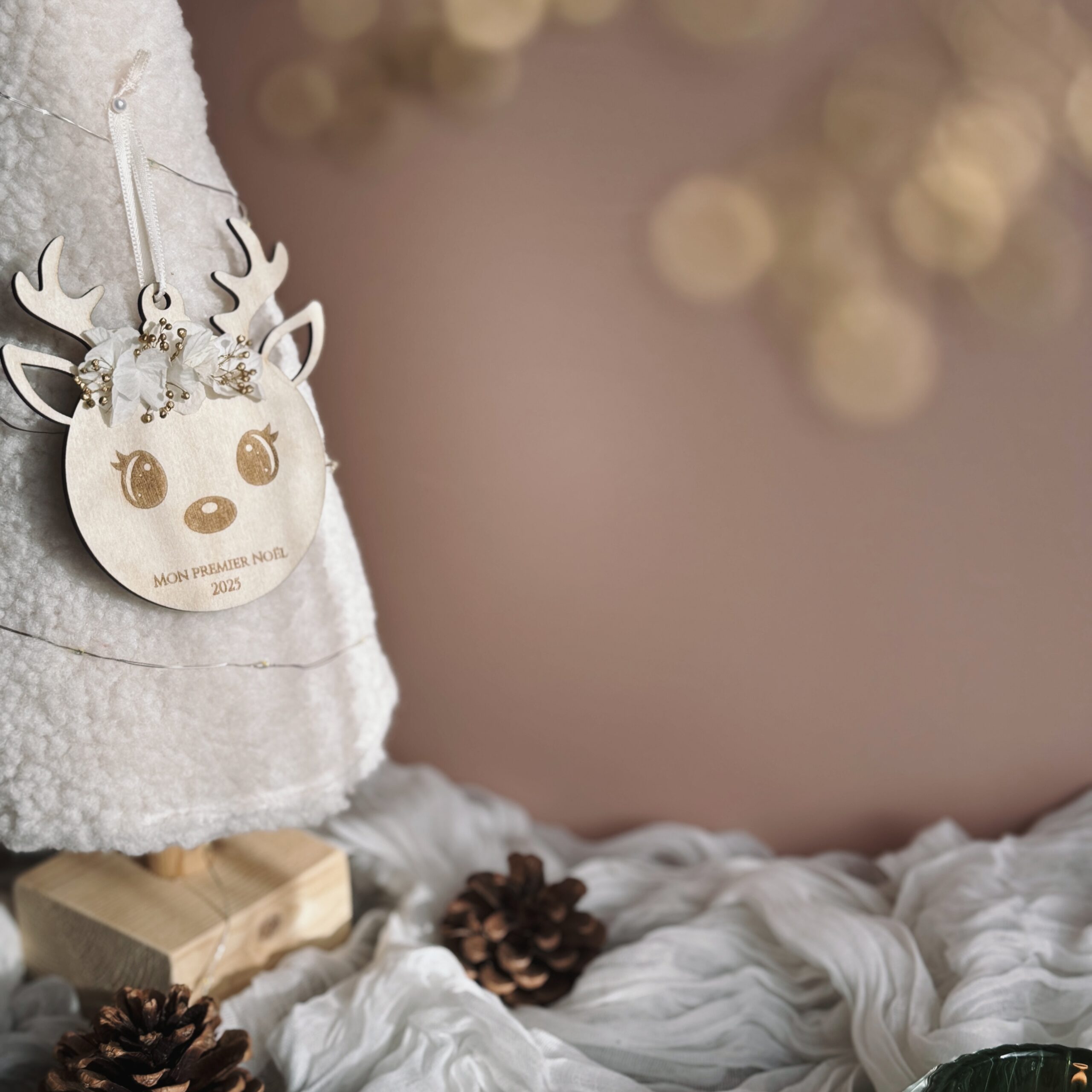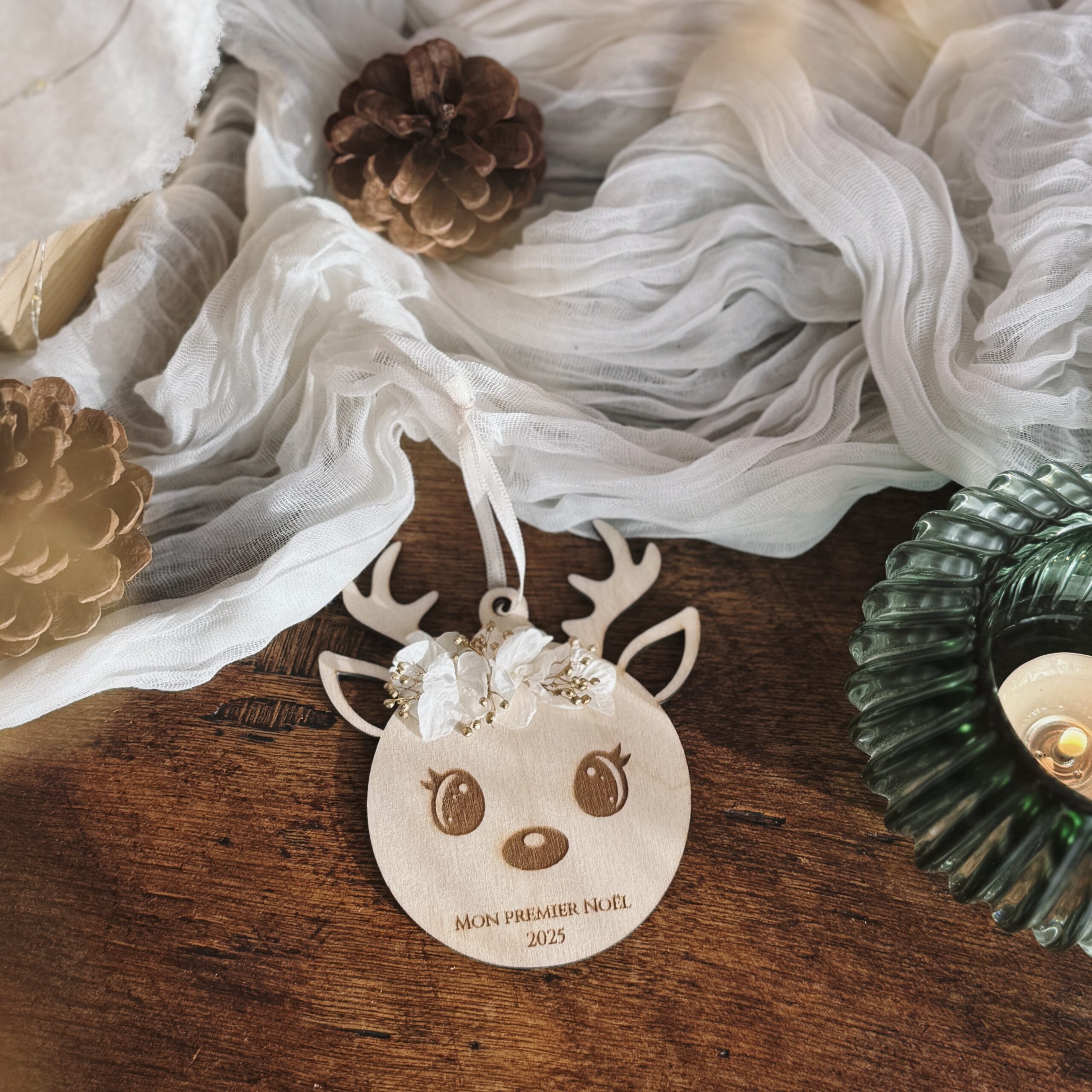 Chaque pièce est réalisée sur commande dans mon atelier à Pau : je grave le texte de ton choix — un prénom, une date ou un petit mot doux — puis j’orne la tête du renne d’un mélange subtil de fleurs séchées blanches et dorées, pour un rendu à la fois naturel, élégant et magique.