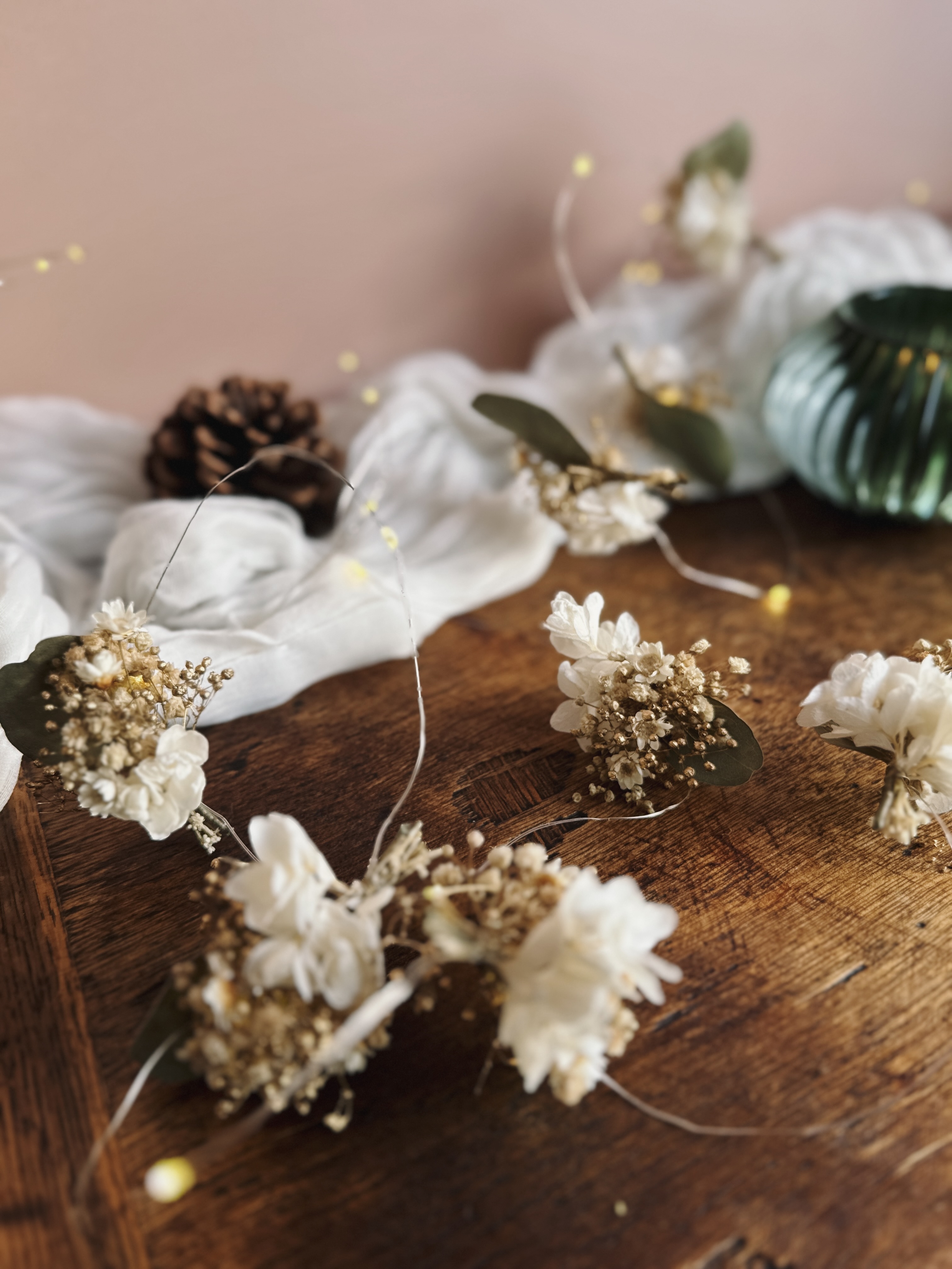 Composée de fleurs et feuillages stabilisés aux tons vert pâle, crème et doré, elle évoque un goût du détail raffiné et diffuse une ambiance raffinée, discrète et chaleureuse. Elle se prête à toutes les ambiances : naturelle, bohème, minimaliste ou chic.