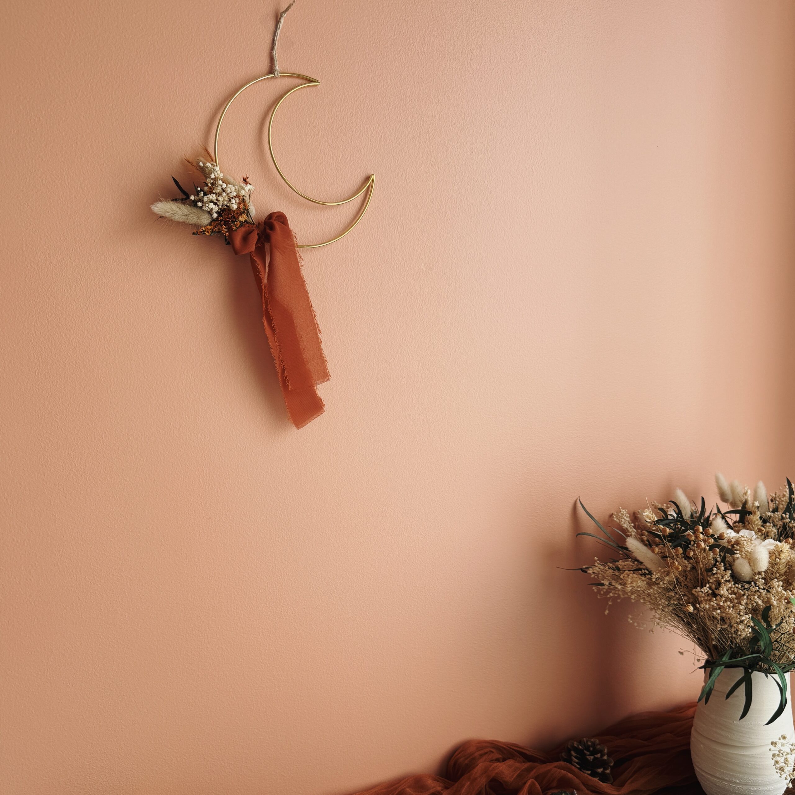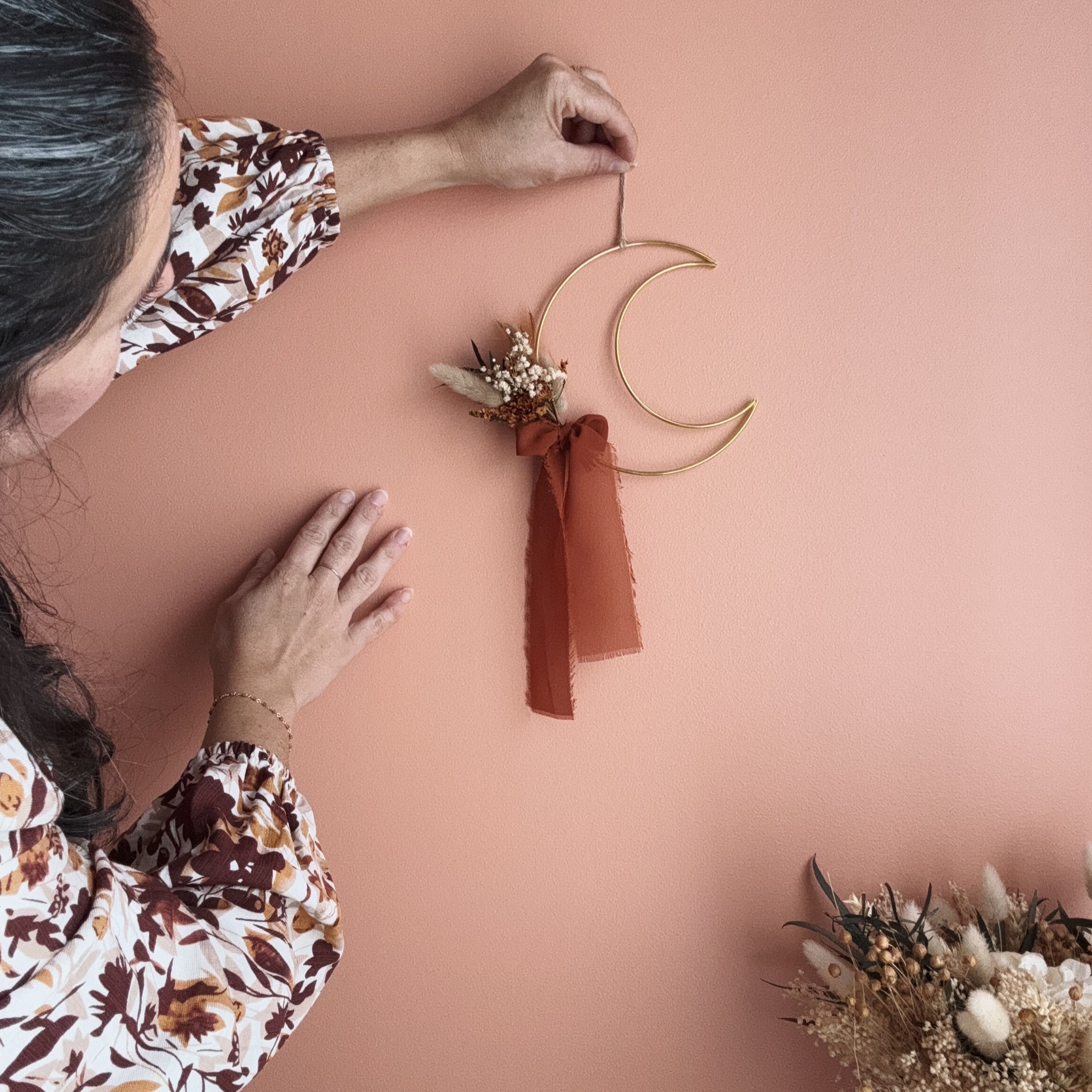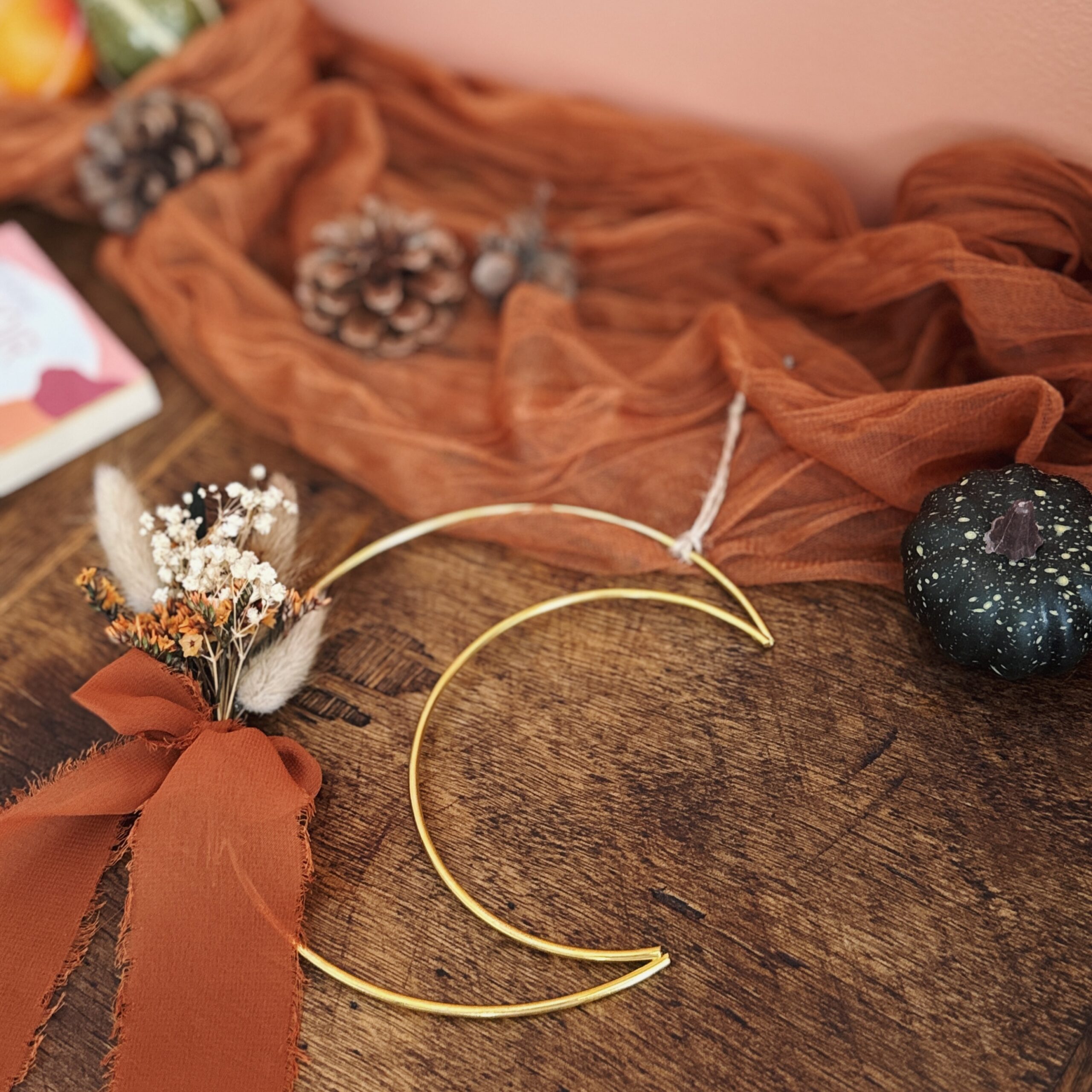 Inspirée par la lueur chaude du soleil d’automne et la magie des soirs de cette saison, cette couronne en forme de lune incarne la paix intérieure et le réconfort des petits rituels du quotidien. Les fleurs orangées, associées au ruban terracotta, évoquent la chaleur du foyer et la joie simple d’un instant partagé.